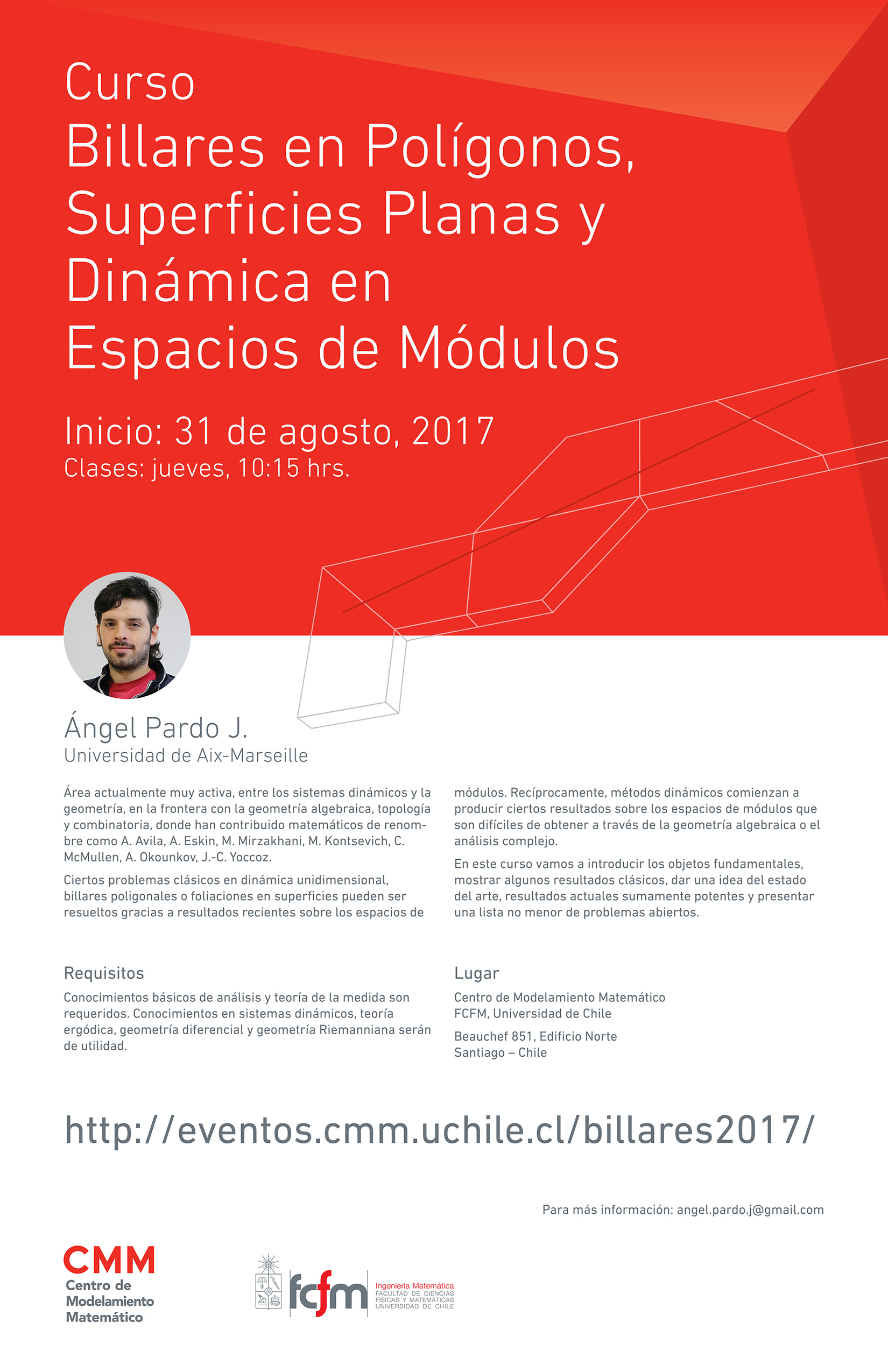 El Curso Billares en Polígonos, Superficies Planas y Dinámica en Espacios de Módulos es dictado por Ángel Pardo J. (Universidad de Aix-Marseille, Francia).
